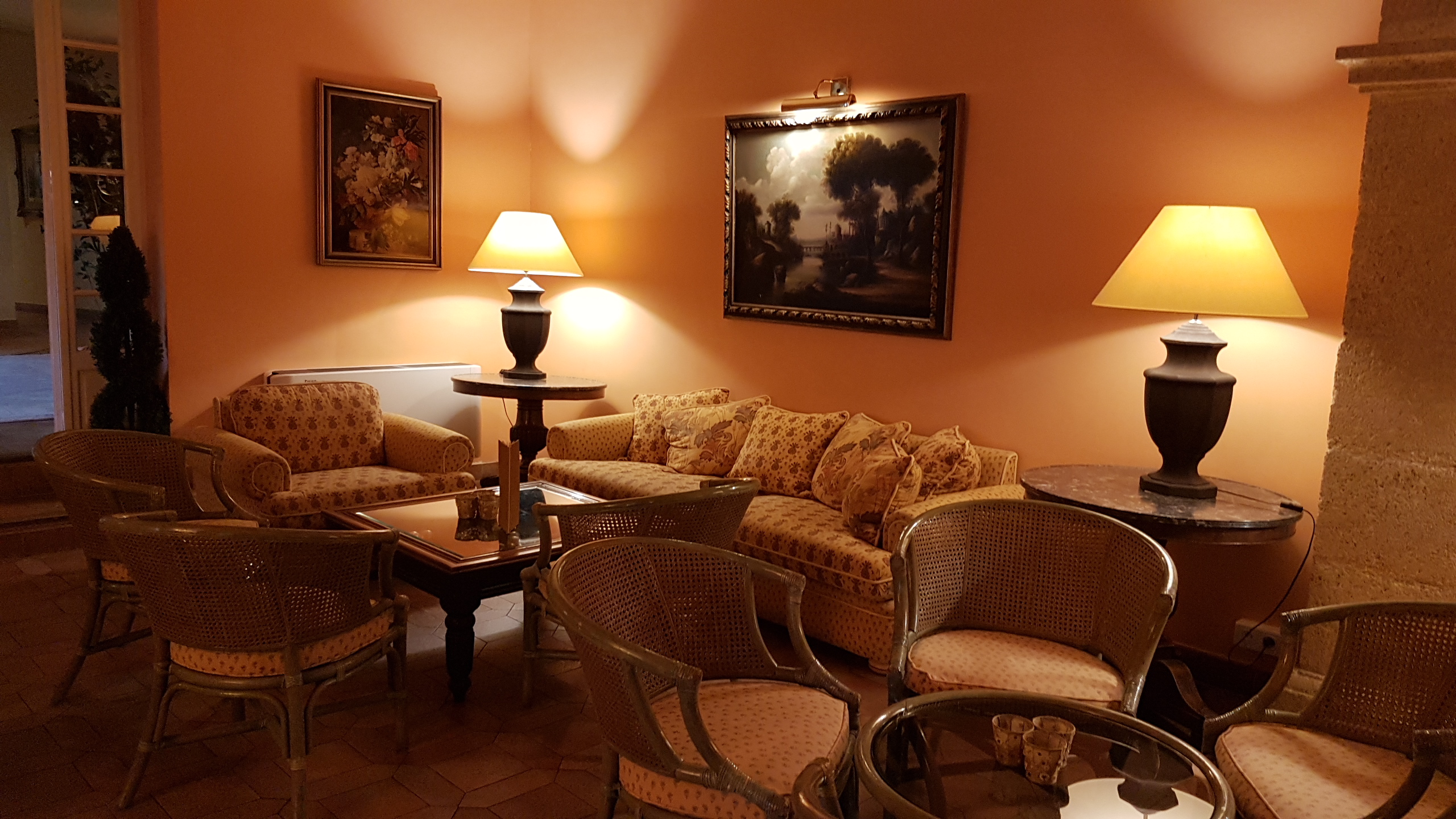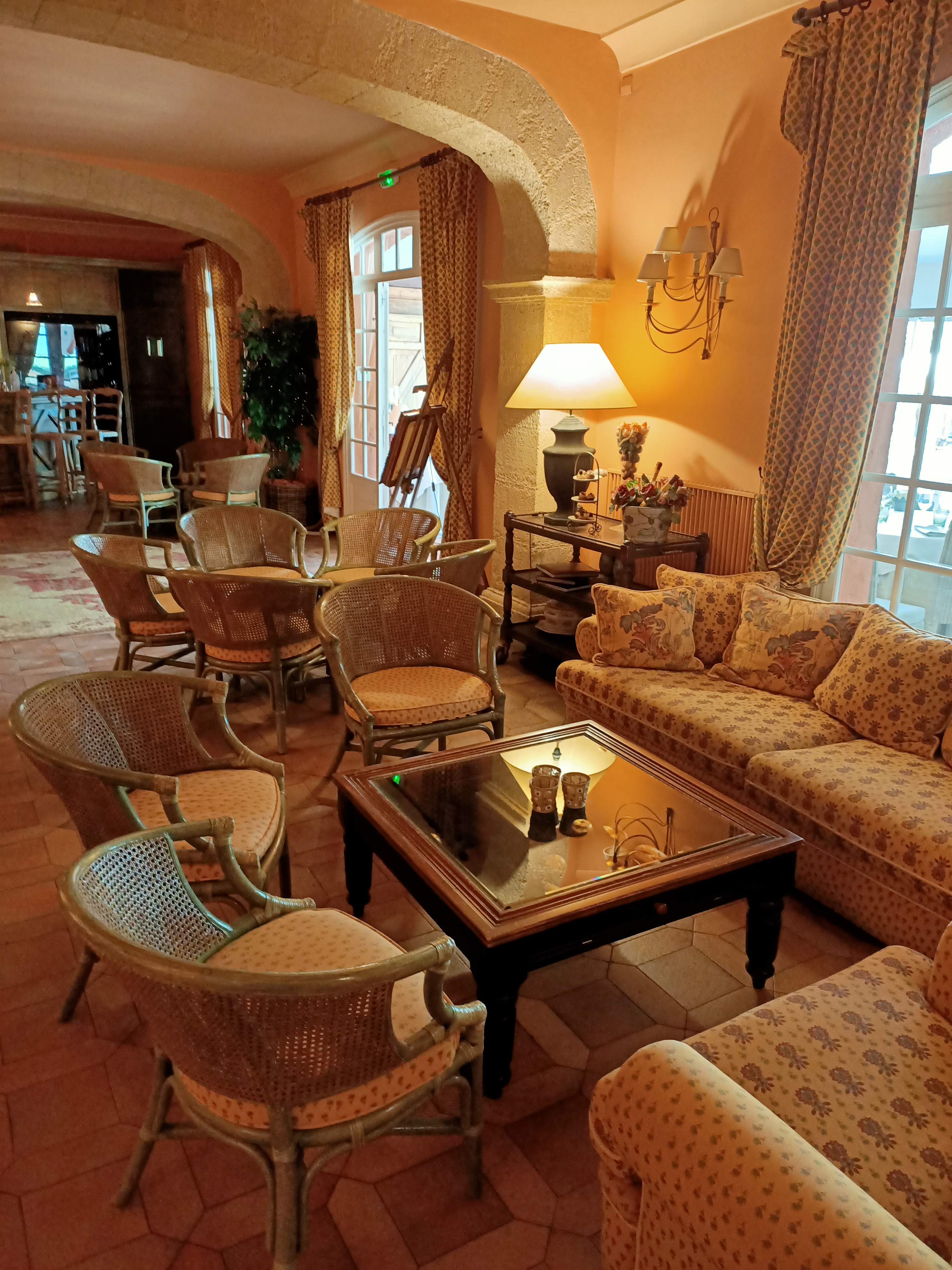 Bel hôtel et bon accueil, déco champêtre campagnarde dans le salon et les chambres et couloir, suffisamment grandes pour la plupart, bon petit déjeuner, idéal calme, piscine (et héliport pour les touristes fortunés !!) Salon et bibliothèque Seul vrai défaut, cette extension véranda en plastique qui tranche avec le bâtiment ! Les repas sont délicieux ! 👍🏼 Région à raisins et truffes, proche de très beaux villages comme Tourtour... Très belle région !