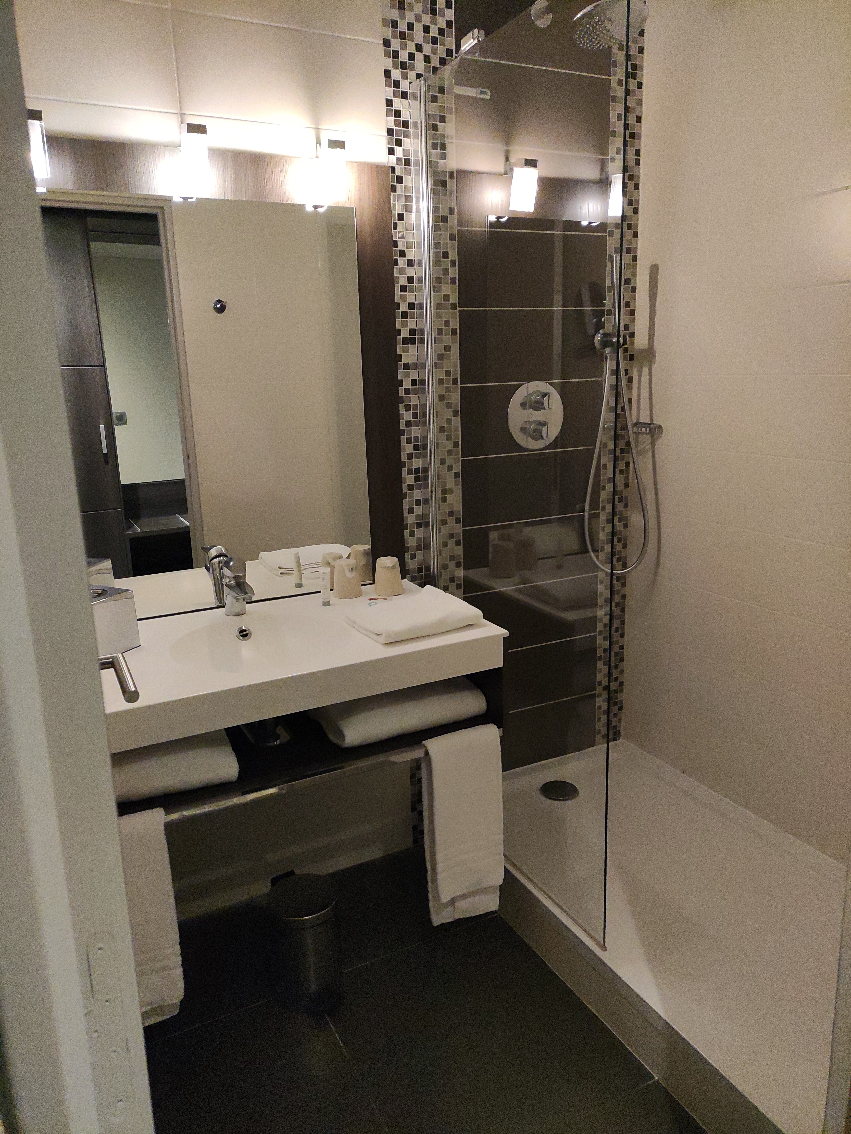 Chambre spacieuse et propre mais manque un peu de modernité. Le personnel de l’accueil et du restaurant était le soir comme le matin très sympa. Le séjour s’est en revanche terminé sur une note amère puisque je me suis rendu compte le soir en rentrant à mon domicile que, dans la précipitation de mon départ, j’avais laissé ma brosse à dents électrique sur l’évier de la salle de bains. Curieusement, après avoir joint la réception le soir même puis le lendemain matin, ma brosse à dents s’était déjà volatilisée.. La personne que j’ai eue au téléphone n’avait pas l’air surprise.