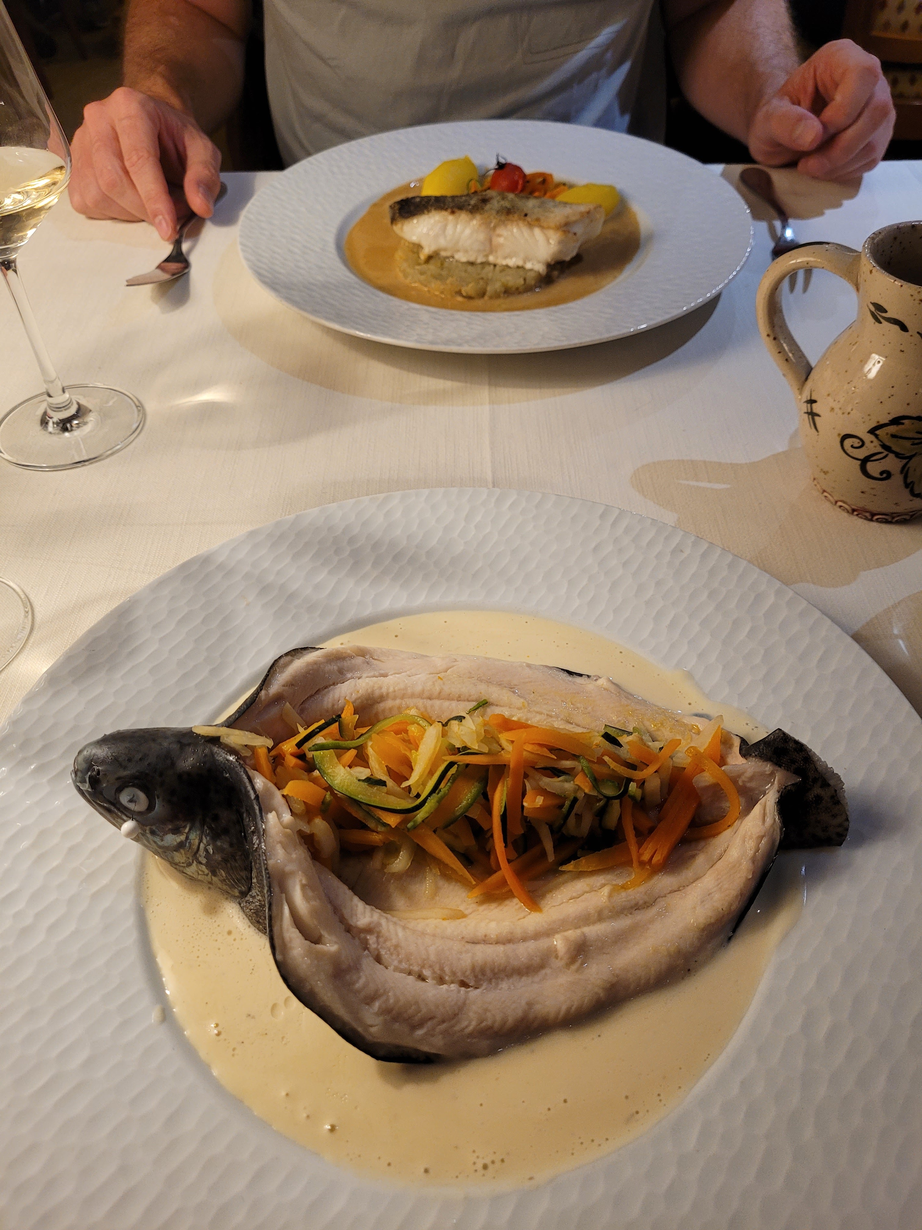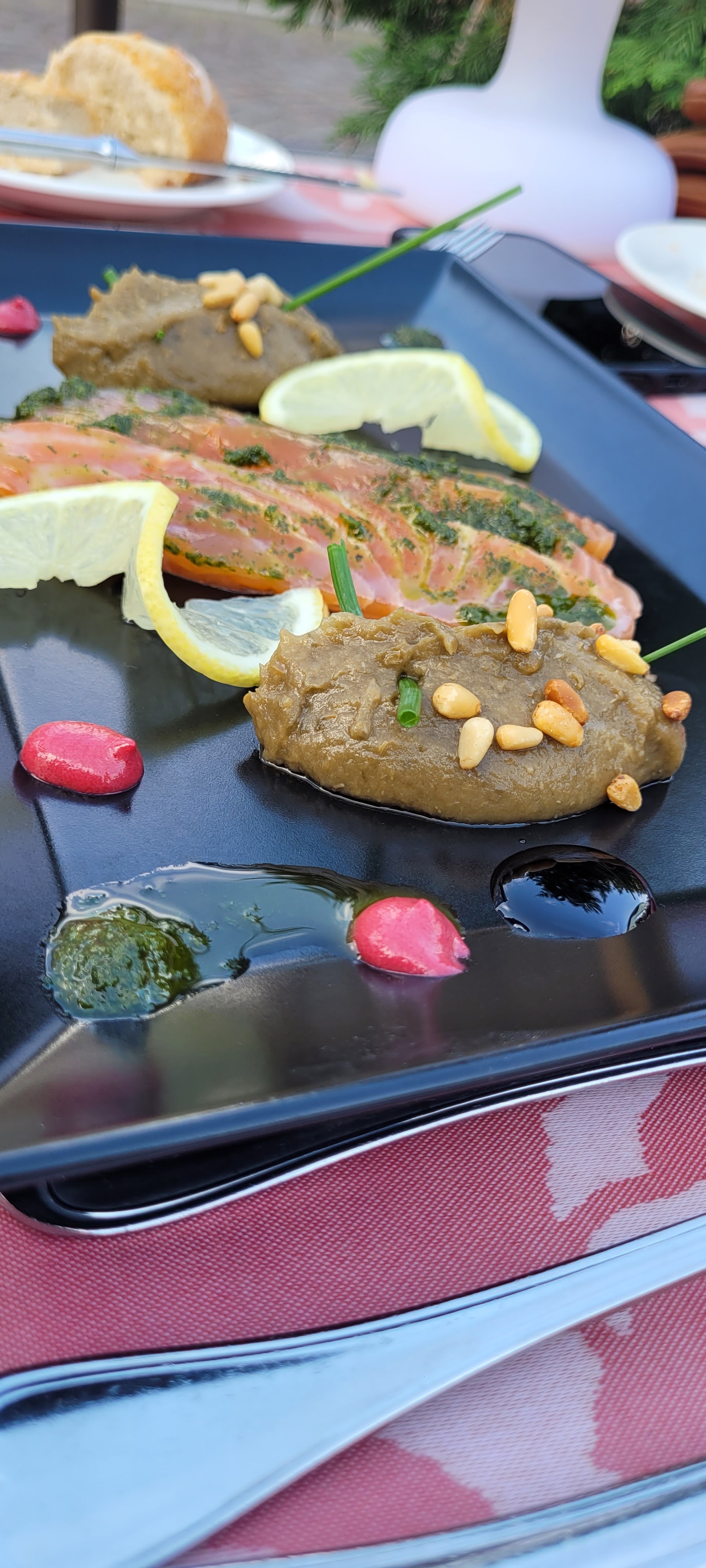Tout d’abord, je ne critique que le restaurant, nous n’étions pas clients de l’hôtel. Nous nous sommes assis dehors devant la vieille fontaine qui était joliment décorée de fleurs, le service sous la forme de plusieurs dames a été très rapide, très sympathique en français et en anglais. et la langue allemande (peut-être plus ?). Mon partenaire a pris 2 entrées, du saumon et des escargots. J'ai choisi un menu composé de mon choix de saumon, d'agneau et d'Eiskugelhupf. Nous vous recommandons de consulter au préalable le site Internet et la carte. Cela vous expose moins à devoir prendre une décision rapidement. Il existe 4 menus dans différentes gammes de prix ou une version végétalienne et vous pouvez choisir entre au moins 2 plats pour chaque menu... Il y a aussi une grande carte des vins, y compris ceux de notre propre cave. Le rapport qualité-prix est tout à fait raisonnable et nous reviendrons avec plaisir ! Malheureusement, les choses sont pires en matière d'accessibilité. En été, vous pouvez vous asseoir dehors, mais le restaurant et l'hôtel ne sont accessibles que par des escaliers.