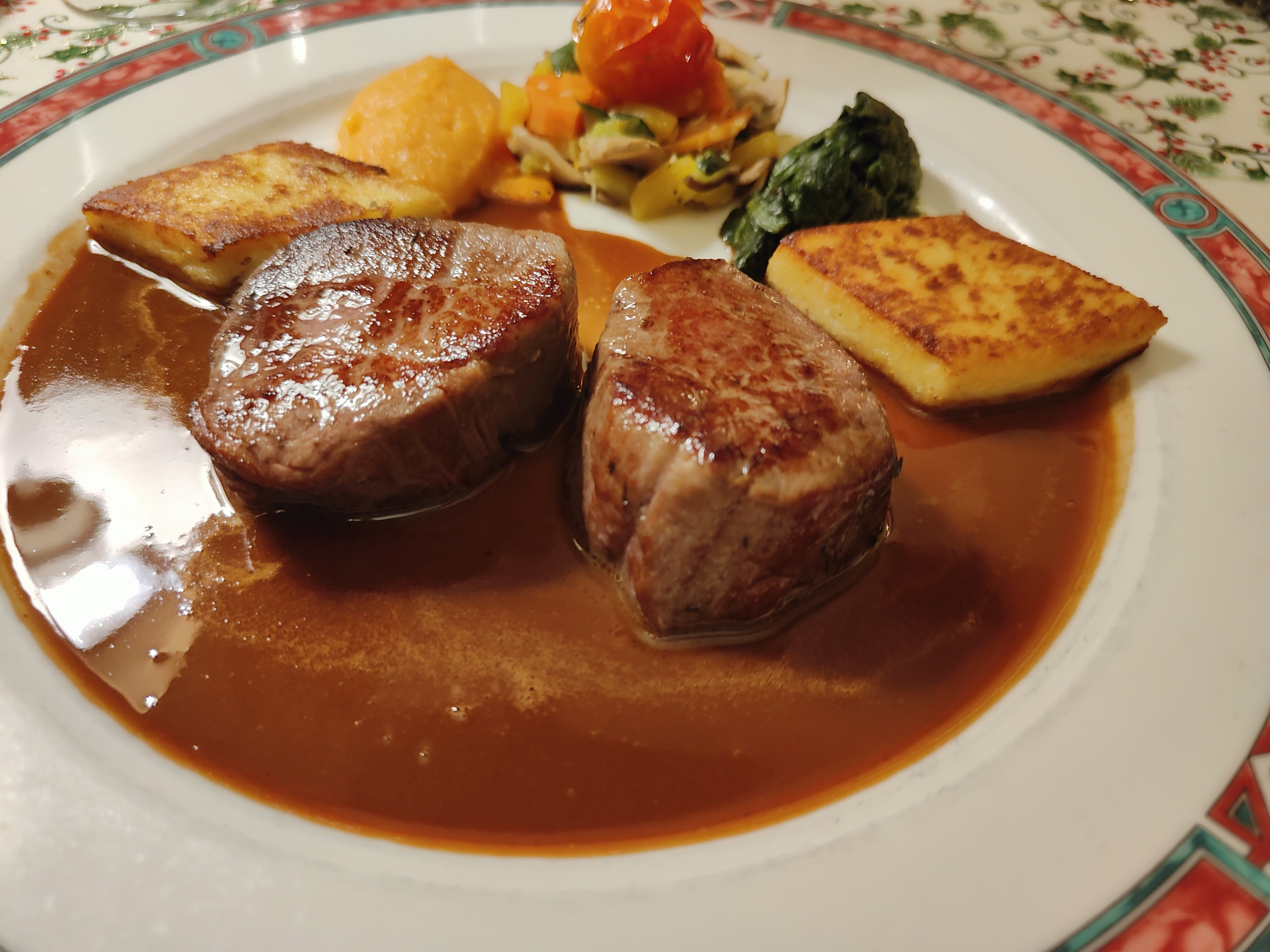 Filet de boeuf au lard fume, au top!!!!! Je n'ai pas pu profité de l'hôtel juste du restaurant. Accueil très chaleureux. on s'y sent bien. Le chef est vraiment talentueux. Personnel à l'écoute et discret. Je recommande sans problème.