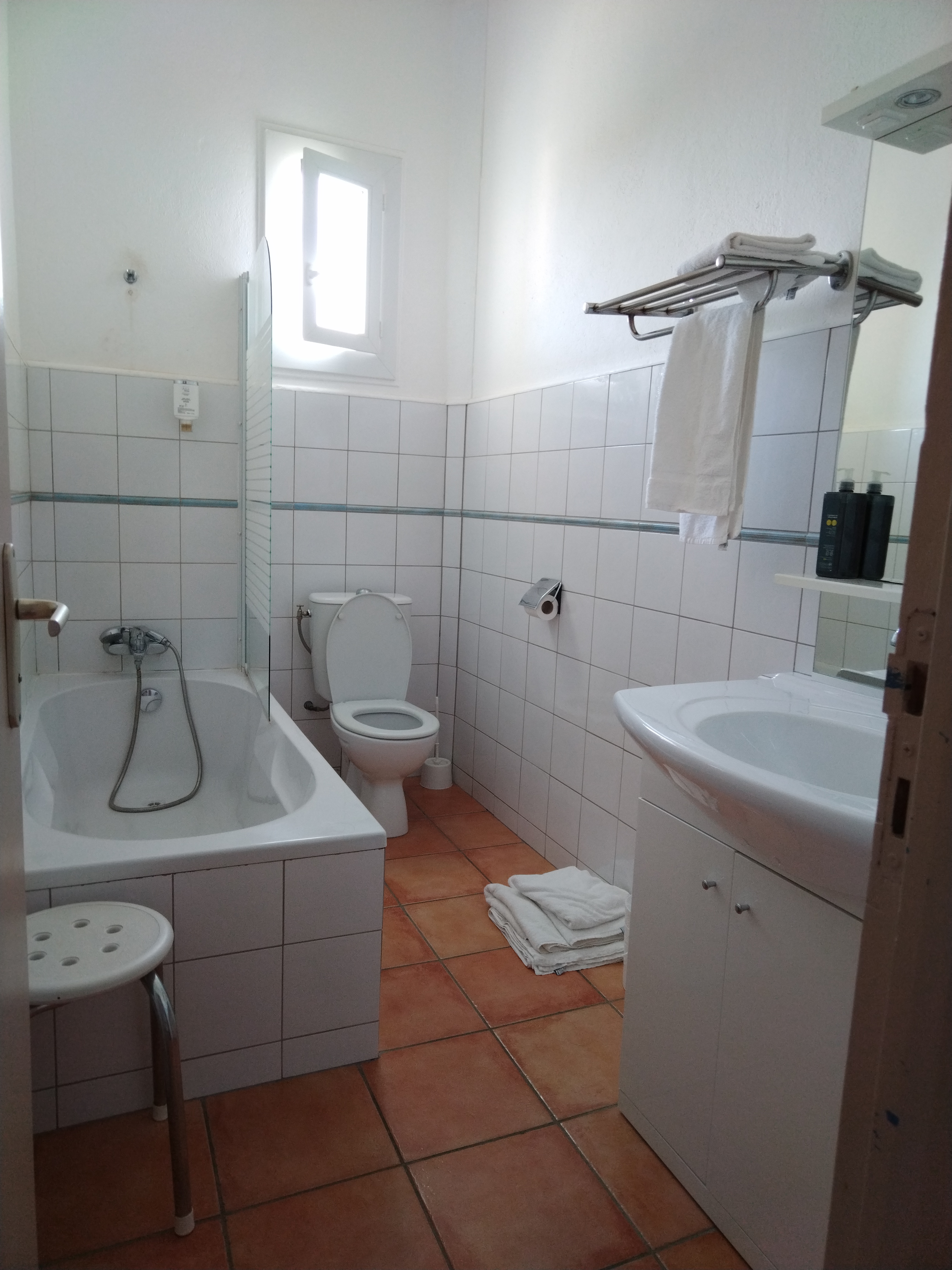Hotel avec piscine bien sauf la baignoire serai mieux si c était une douche et une pomme de douche qui fonctionne normalement et que l on puisse accrocher plus haut pour les grands