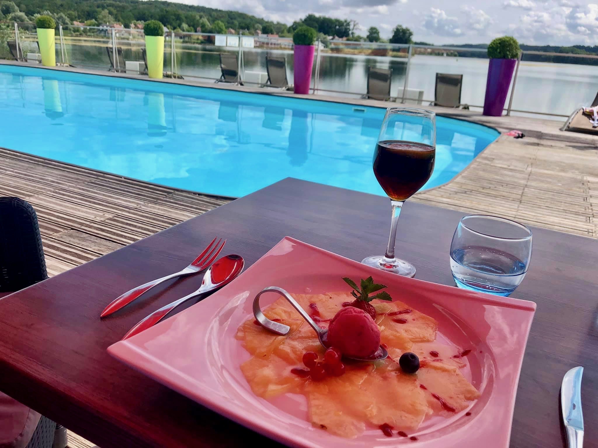 Nous avons déjeuné au restaurant de l’hôtel, au bord de la piscine et du lac, c’est un endroit charmant, très agréable. (Photo) Le menu du jour : steak de thon, cuisson rosée et ses légumes, un moelleux au chocolat pour 28,90€. La coupe de champagne Moet et Chandon est à 13,50€. La proximité de Reims ne réduit pas les prix. Dommage. Mais c’est très bien quand même.