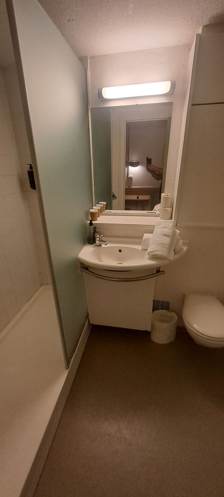 Bon rapport qualité prix, l'hôtel est vétuste et peu d'indication pour le trouver (Pas de panneau sur l'hôtel permettant de l'identifié) les chambres sont propres mais mériteraient un bon rafraîchissement, pas de fermeture de douche par ailleurs très grande, mais pas suffisamment pour empêcher l'eau de sortir et aller au sol du coup on peste sur le fait de na pas avoir de tapis de douche
