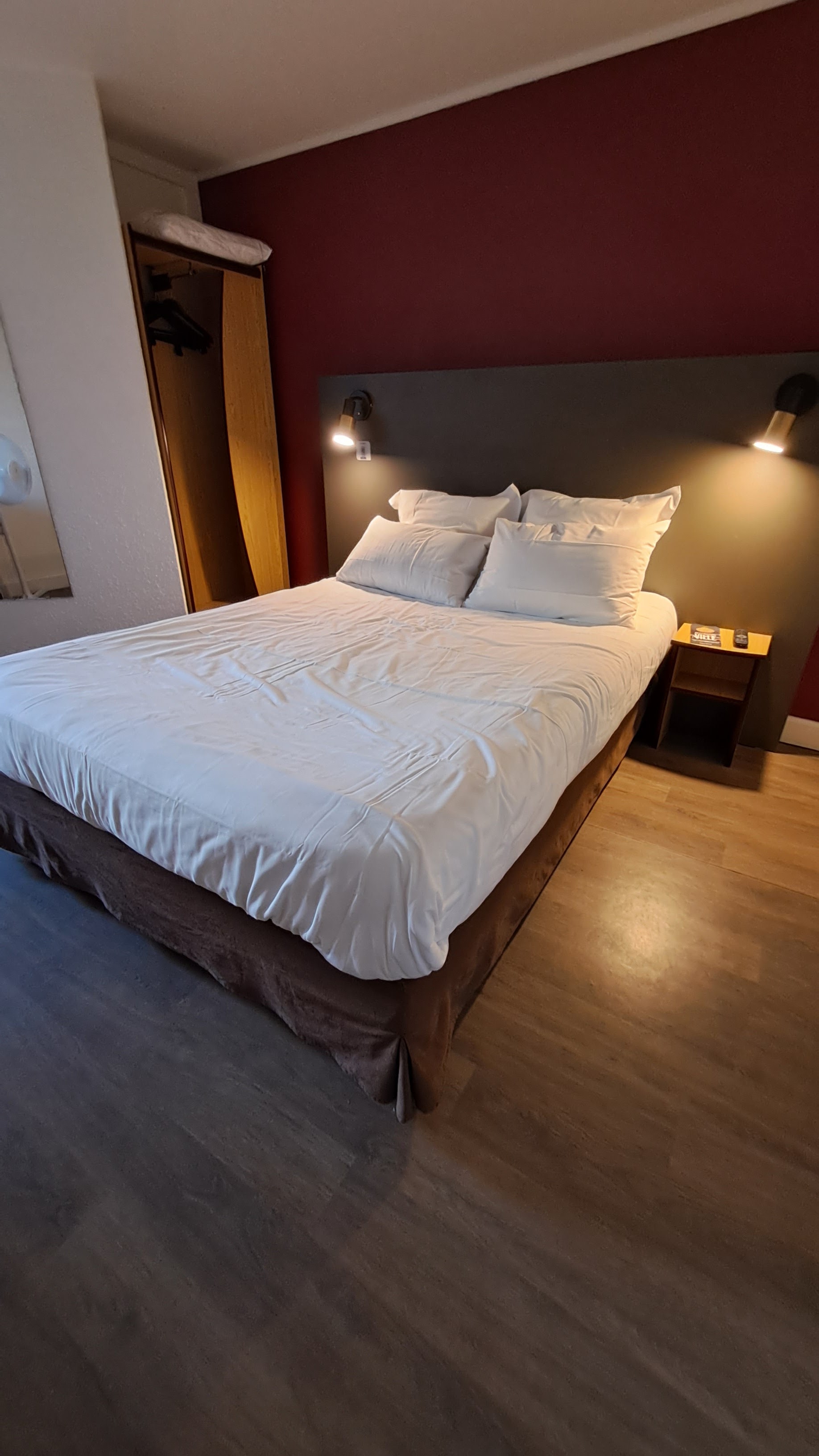 Mes collègues et moi avons réservé des chambres avec des grands lits on nous a donné des chambres avec des petits lits au même prix que les grands à 79 € et le repas du soir extrêmement lent 45 minutes pour un plat qui était froid donc le soir ont mangera ailleurs et dormiront aussi ailleurs la prochaine fois