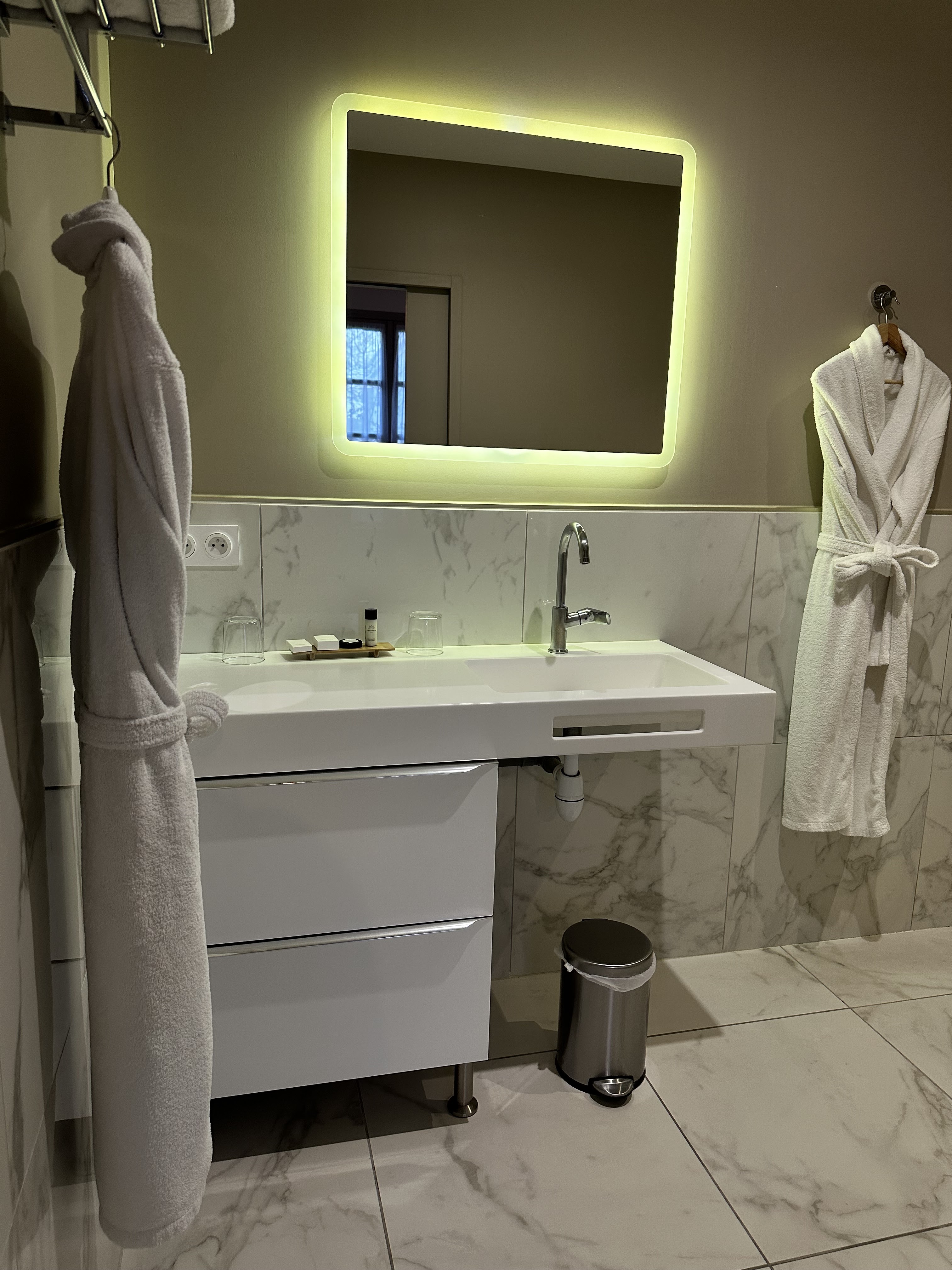 Super chambre et petit-déjeuner en chambre agréable. La salle de bain est très bien et spacieuse mais un spot au dessus du miroir ne serait pas de trop 😉
