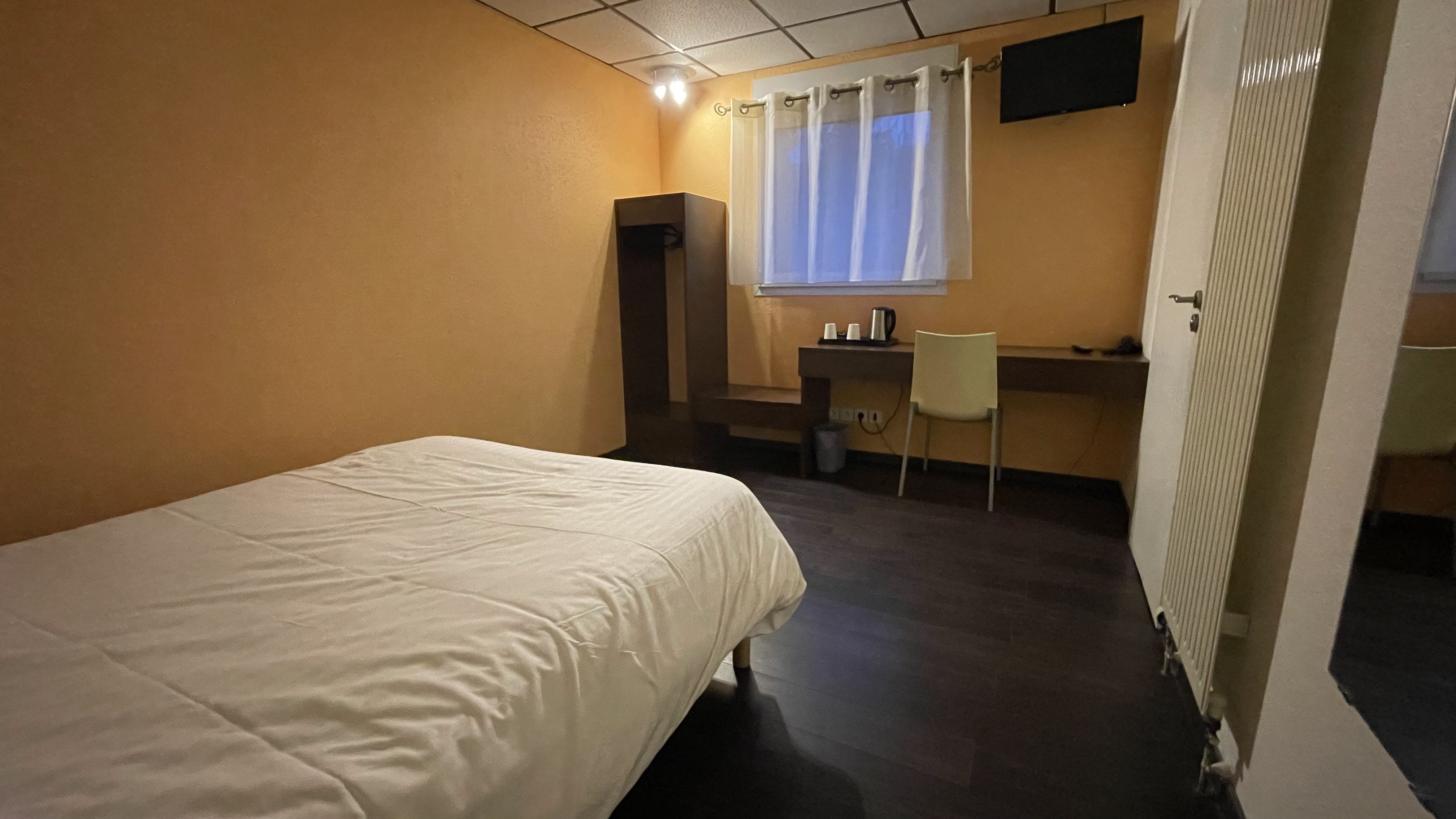 En déplacement professionnel, je pensais arriver dans un Kyriad avec un service minimum de ce type de chaîne hôtelière. Hors nous arrivons dans un hôtel qui n'est absolument pas un Kyriad. A priori ils sont en train de passer Kyriad mais vu les avis sur Google, ça fait au moins 8 mois que nous pensons arriver dans ce type d'hôtel mais non. Pour l'accès voiture, nous arrivons sur un parking d'entreprise de bâtiment (ou autre chose peut etre). Finalement nous ne savons pas trop où nous tombons. Ça ne met déjà pas trop en confiance. Arrivée dans la chambre qui était au RDC, vue de la fenêtre sublime sur des debrits. Ça ressemblait à une petite décharge de l'hôtel ou de l'entreprise. Peut être les travaux en cours de l'hôtel. Arrivée dans la salle de bain, pas de bac de douche, seul un rideau tendu entre le lavabo et les WC avec pas mal de moisi au sol. Le sol des sanitaires pas propre, aucune envie d'y poser ses pieds nus. Le plafond de la chambre est fait en vieilles dalles de plafond sales avec joints noirs. La peinture de la chambre est verte histoire de donner une ambiance encore plus glauque à tout ça. Aucune prise electrique accessible alors qu'on a bien besoin de charger son téléphone pour faire diversion avec l'environnement de la pièce. Mais, WiFi accessible et la literie semblait propre. Je n'ai pas pu rester dormir sur place, j'ai pris la route pour Luxueil là où les tarifs ne sont pas vraiment plus chers et où les prestations minimales sont présentes et plus encore. Je ne recommande pas du tout cet hôtel. Vu le nombre de voiture sur le parking (une seule), je crois que ça se sait qu'il fait éviter cet hôtel. Je ne me suis pas méfiée en voyant Kyriad mais on ne m'y reprendra plus !