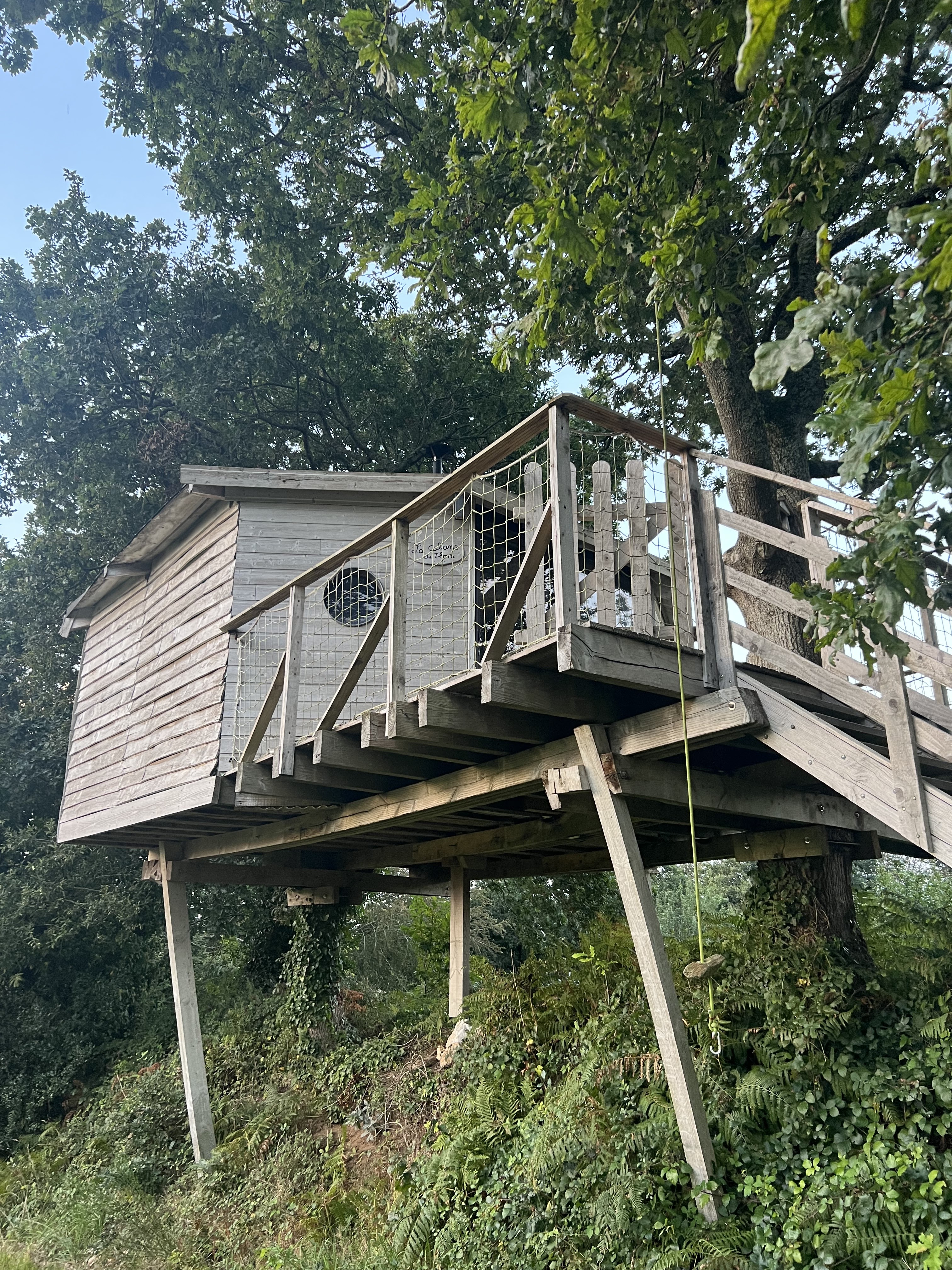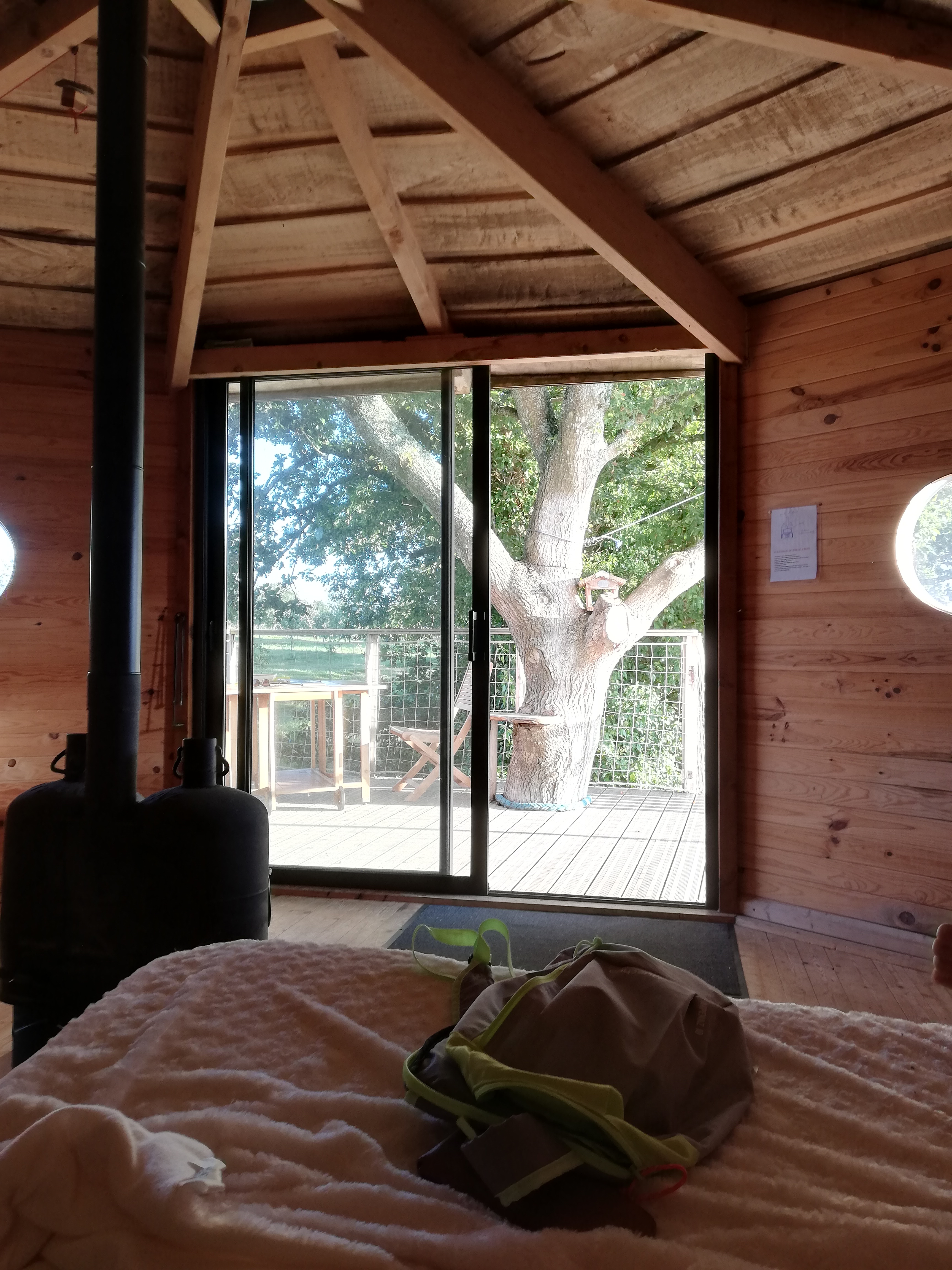 Nous avons reçu un sms de la propriétaire la veille pour nous annoncer qu'on pouvait arriver à 18h (alors que le tract annonçait une arrivée possible entre 15h et 18h30). Un peu déçu de ne pas pouvoir venir avant 18h, mais cela nous a permis de visiter Concarneau, très belle ville. La localisation du site est assez mal signalée. Il nous aura fallu faire quelques kilomètres et demander à des enfants jouant devant chez eux pour réussir à trouver l'endroit. Nous avons été gentiment accueillis par la propriétaire des lieux. Elle nous a guidé jusqu'à la cabane, qui se trouve plus loin, dans un endroit intime et éloigné de toutes habitations. Charmante cabane, composée de 3 lits, dont 1 double, de toilettes sèches, d'un poêle à bois ! Bref, tout pour bien profiter. Petit bémol, la grande baie vitrée offrant une belle vue, ne dispose pas de rideaux ... Le but est j'imagine de profiter de la vue, mais en pleine nuit, on aimerait avoir le choix de fermer les rideaux. Le bruit des glands qui tombent sur le toit nous a quelque peu empêché de dormir, mais c'est ça la nature ! Une cabane dans un chêne entraîne forcément ce genre de petit désagrément. Pour garder l'authenticité, des lampes frontales et une lanterne sont fournies. Le petit déjeuner, très bon, est accroché à une corde le matin, pour ne pas nous déranger à frapper à la baie. Nous avons passé un très bon moment, malgré les 4 degrés matinaux. Les + Coin intime Bon accueil Prix très raisonnable Cabane charmante Poêle à bois dans la cabane ! (pratique quand on part hors saison) Les - Arrivée tardive (18h) Départ exigé à 10h, trop juste pour profiter du lever du soleil, et du petit déj Pas de rideaux aux fenêtres (réveillés par le soleil le matin) Nous reviendrons l'année prochaine !