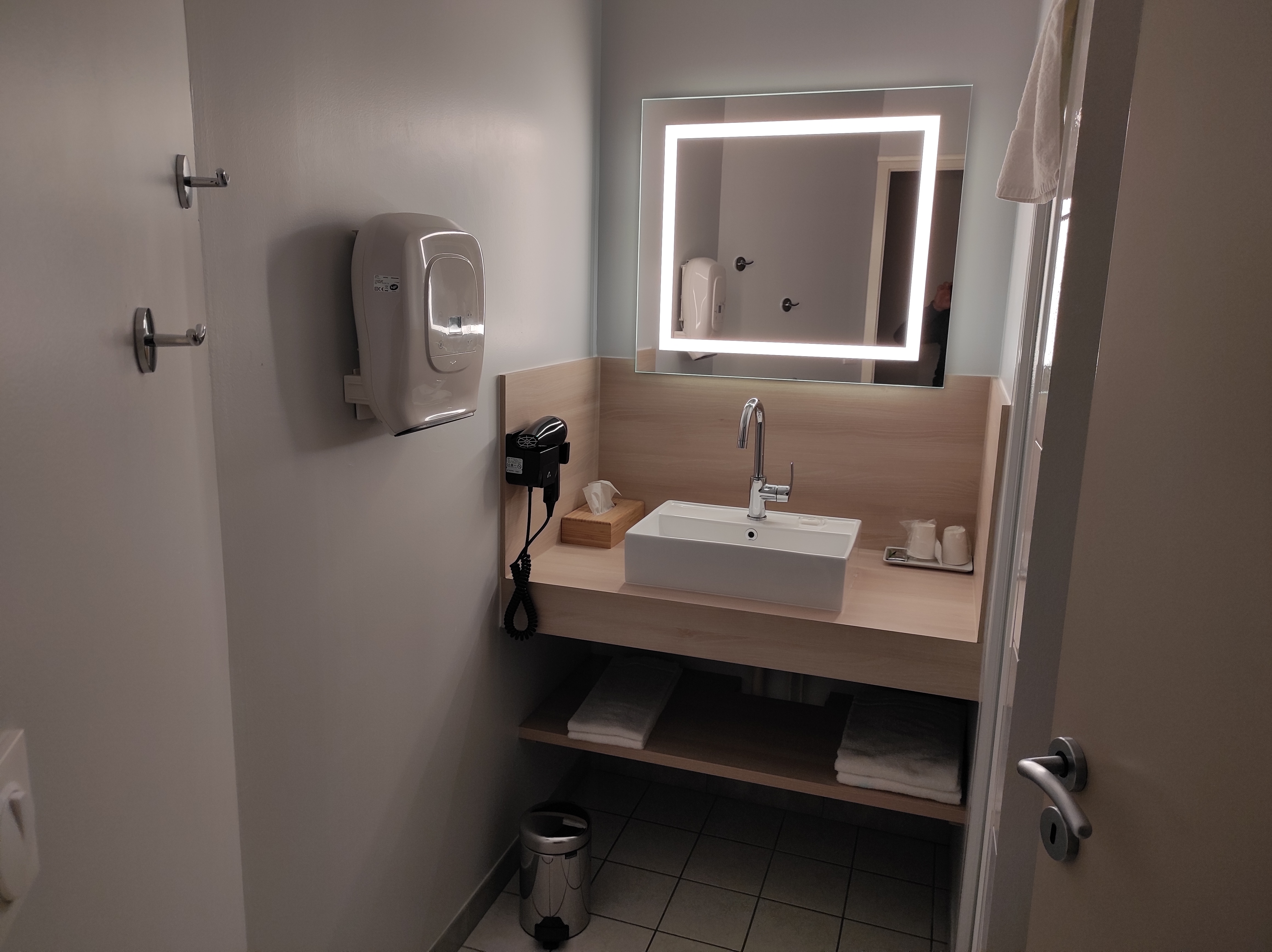 Arrivés apres 21.00, nous avions eu un appel de la reception une heure avant Nous avons reçu le code d entrée et le numero de la chambre Et quelle chambre! Salle de bain spacieuse avec wc surélevé, siege de douche, essuies en profusion et petits savons de bienvenue Lits ayant l air tres confortables, belle couette Pieces remises récemment à neuf ( on sent encore la peinture dans les couloirs) Au calme, dans un petit village Plus qu à tester ces lits et leur petit déjeuner! Moi je mets une etoile de plus⭐⭐⭐