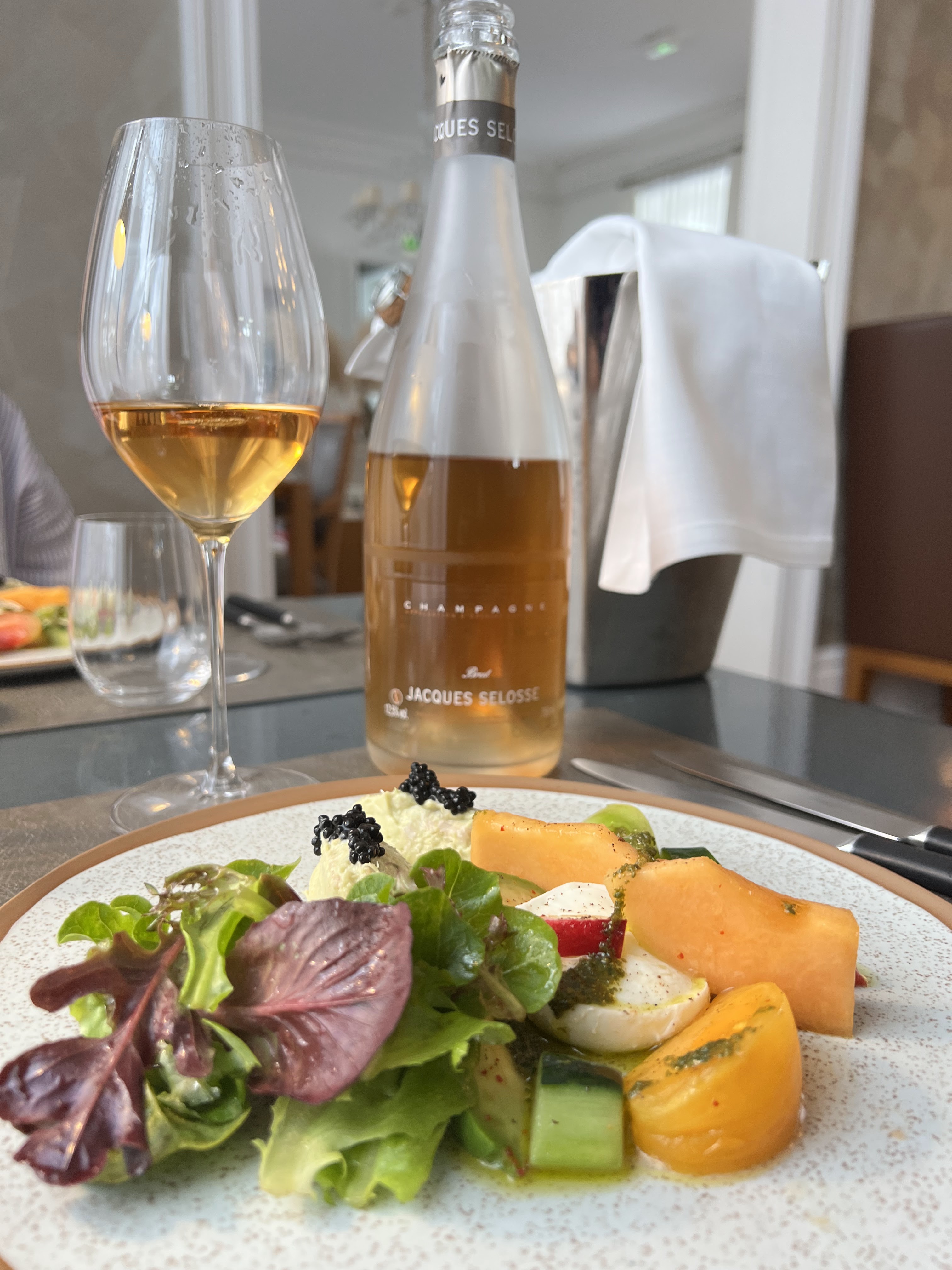 Le restaurent et l’hôtel font partie de la maison Selosse. Pour ceux qui ne connaissent pas, Selosse est au Champagne ce que Rolls Royce est à l’automobile. L’excellente, la rareté, le seul dans sa catégorie. Les vins sont naturels, biodynamiques, parfois oxydatifs, fabuleusement profonds, vrais, vineux, terreux, une pure merveille plutôt destinés aux amateurs chevronnés. La partie hôtellerie est superbe, confort et luxe associés, et le restaurant est du même acabit. Menu unique, pas de carte, à part celle des vins qui est divine et complète. Des vins rares (Dagueneau, Ganevat, Berlioz, Rougeard, etc) a des prix raisonnables et les vins du maître des lieux à un prix peu abordable. Mais l’excellence doit elle être abordable ? Nous avons fort bien mangé.