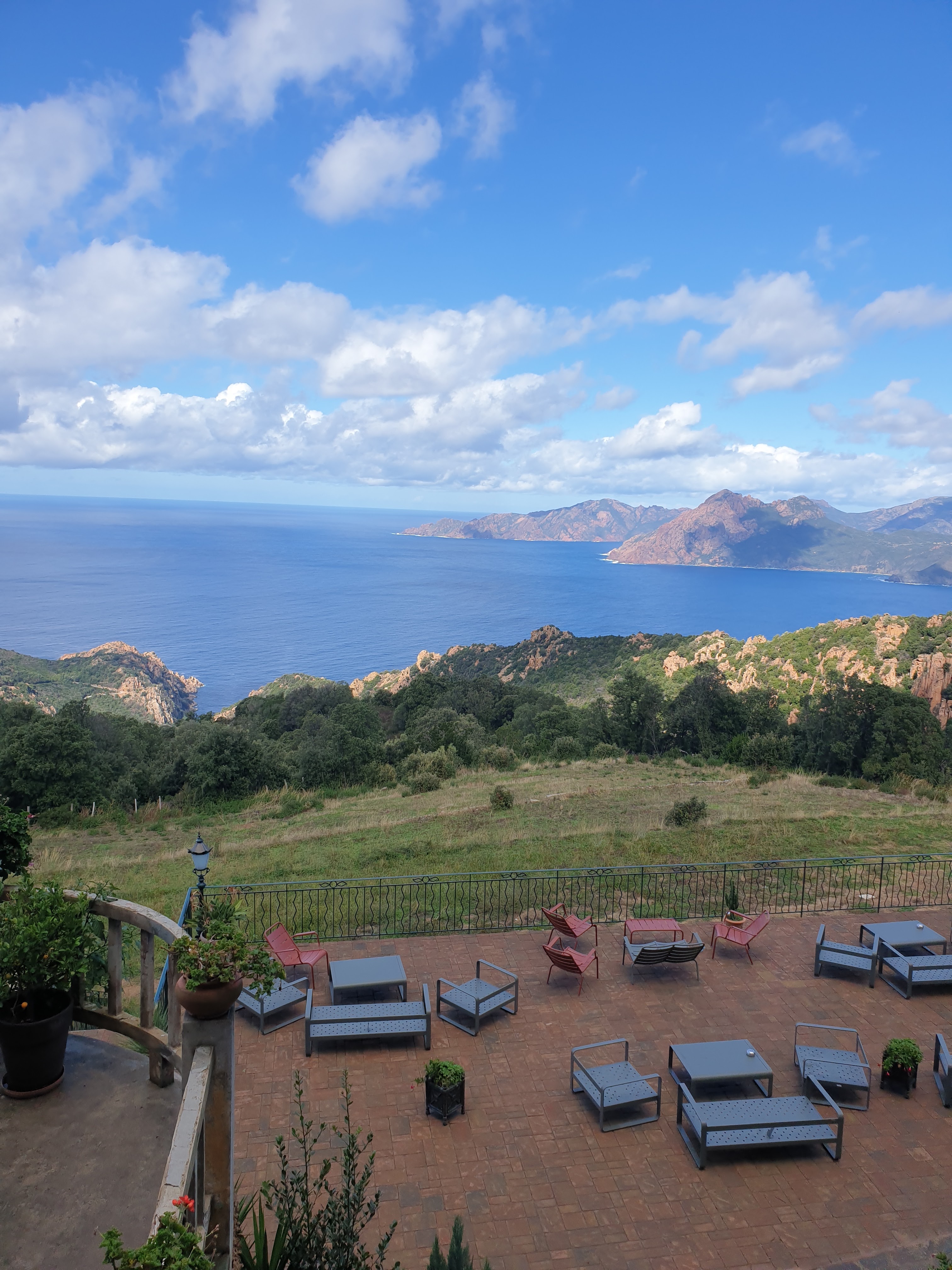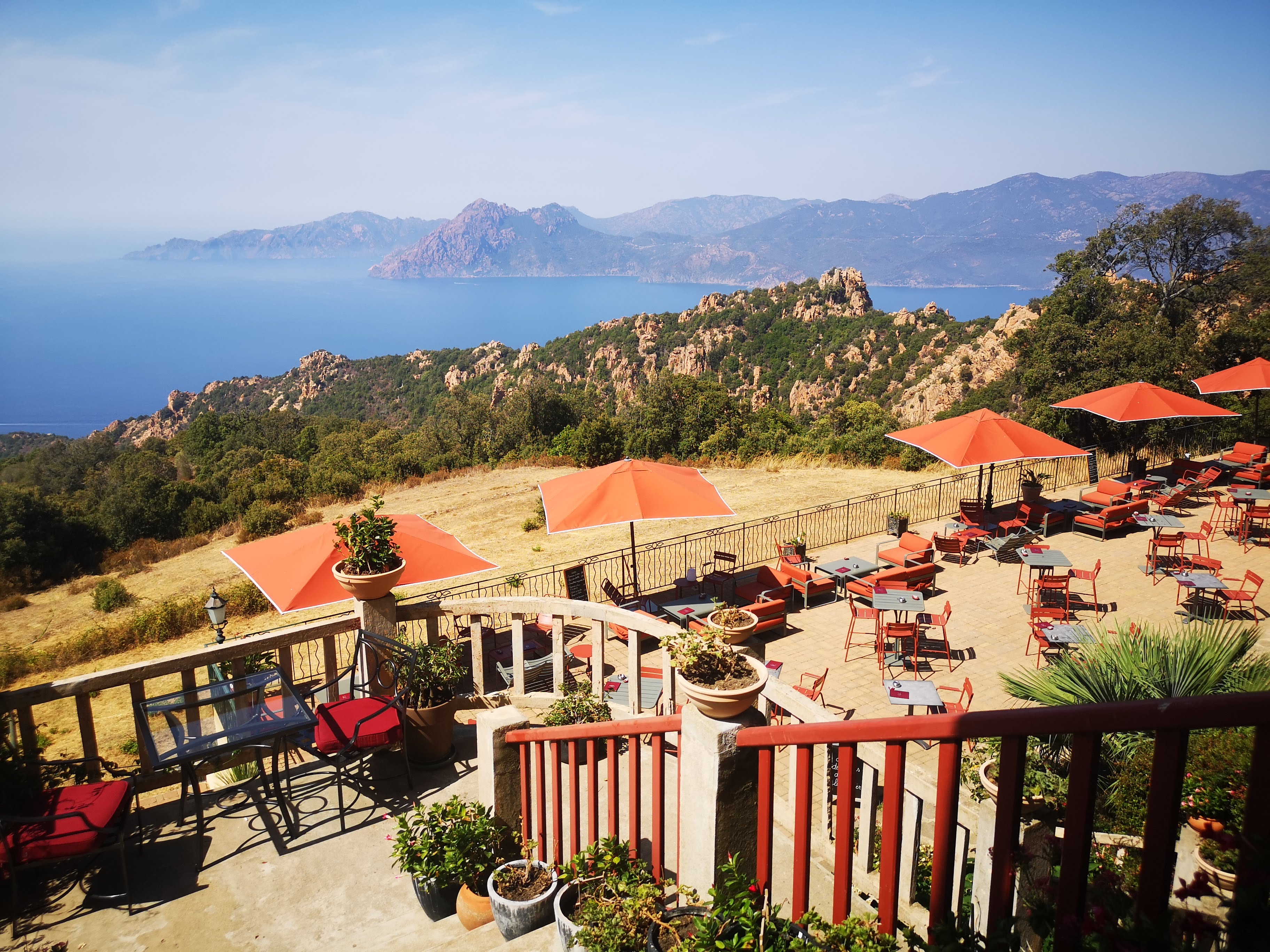 A 2 mn en voiture des calanches de Piana, l'hôtel les roches rouges. Si à première vue, cet hôtel vous semble surrané, ne vous y fiez surtout pas ! C'est une merveille !! Tout est impeccablement tenu, aussi bien les chambres, que les terrasses et le restaurant. Les chambres ont tout le confort souhaité, aussi bien en nécessaire de toilette qu'en literie, et sont d'une propreté irréprochable. Les terrasses sont nombreuses avec un espace incroyable entre chacun des petits salons. Le restaurant est décoré avec goût. Enfin, que dire de cette vue incroyable, d'une quiétude et d'une sérénité sans pareille. Maddy, la propriétaire des lieux finira de vous convaincre que cet endroit est celui où il faut s'arrêter à Piana. Elle vous transmettra tout son savoir sur ce petit coin de paradis d'où elle est originaire. Allez y les yeux fermés. En revanche, si vous êtes à la recherche du modernisme, abstenez vous, mais aucun autre endroit de ce village ne vous permettra de contempler un tel paysage dans un endroit d'un autre temps.