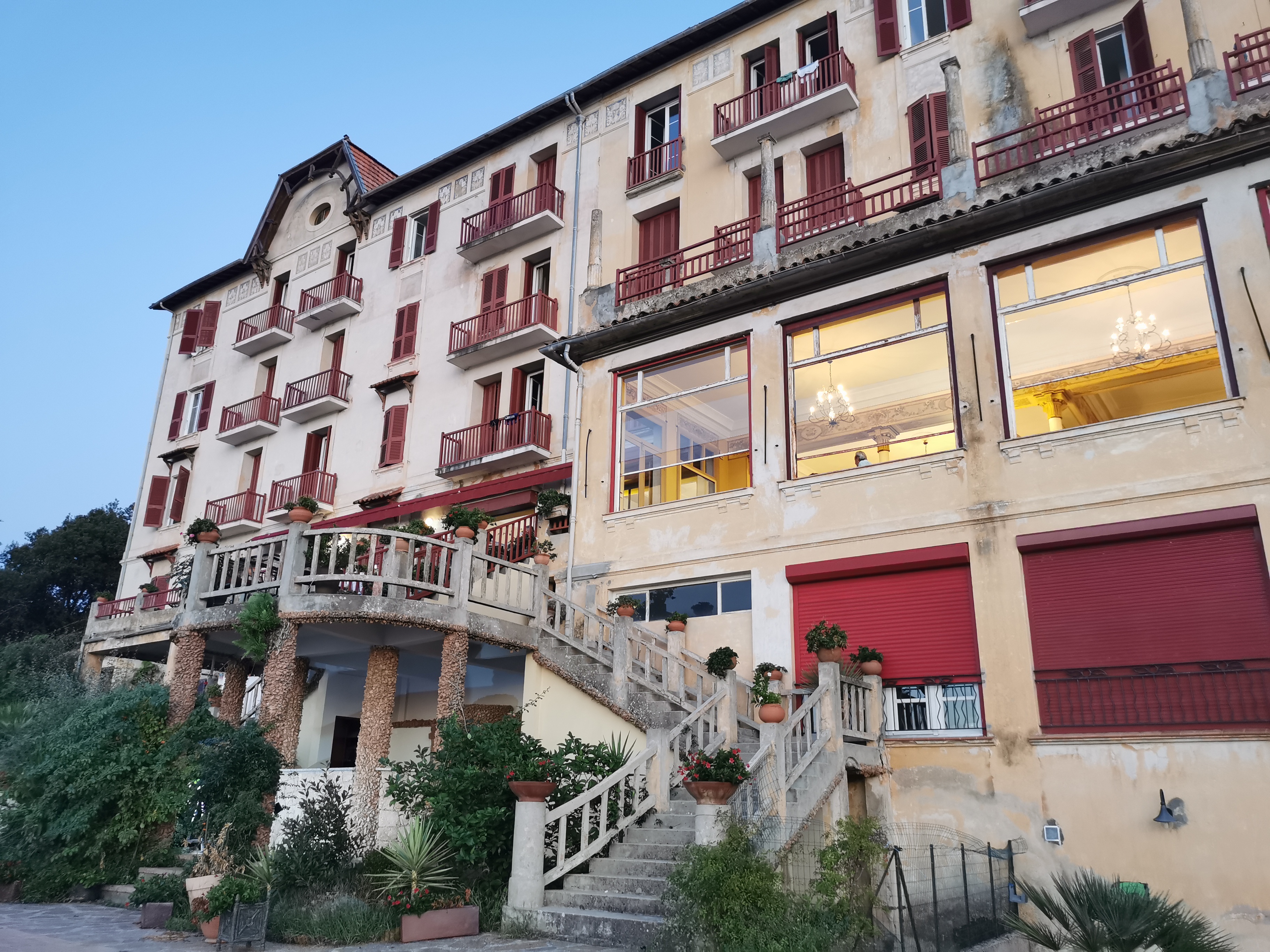 Un voyage dans la splendeur du début du 20eme ! Un bâtiment Art Déco de 1912, avec fresques, moulures et ferronneries d'époque, qui ouvre sur une gigantesque terrasse, avec une vue à couper le souffle sur la mer... Ça vaut le coup même pour boire un cocktail ! - Côté hôtel : les chambres sont spacieuses, les lits confortables, tout en ayant gardé le charme du bâtiment. - Côté restaurant : on est clairement sur du gastronomique, avec une petite carte, a la fois simple et précise. Les produits travaillés ne sont pas que locaux, mais ils sont préparés de main de maître, le foie gras poêlé est délicieux, mention spéciale pour les viandes et le tartare de maigre en entrée. Le coup de coeur est pour le dessert : entremet chocolat olive... Je n'ai jamais mangé un dessert aussi original et aussi bon ! L'équilibre est parfait entre le sucré salé, la saveur de l'olive et le chocolat, ni trop amer, ni trop sucré... Un régal !! Enfin, tout ceci ne serait rien sans le niveau de service de Maddy et son équipe, qui se decarcassent pour que le moment, quel qu'il soit, soit agréable. A la plupart des demandes, la réponse est OUI, aussi souvent que possible... Ici, on se moque éperdument que le client soit en tongs ou en escarpins (même si les seconds sont nombreux) : la simplicité est de mise dans les échanges, la patronne est fidèle à ses valeurs (le fond prime sur la forme), ce qui fait en grande partie le caractère du lieu !