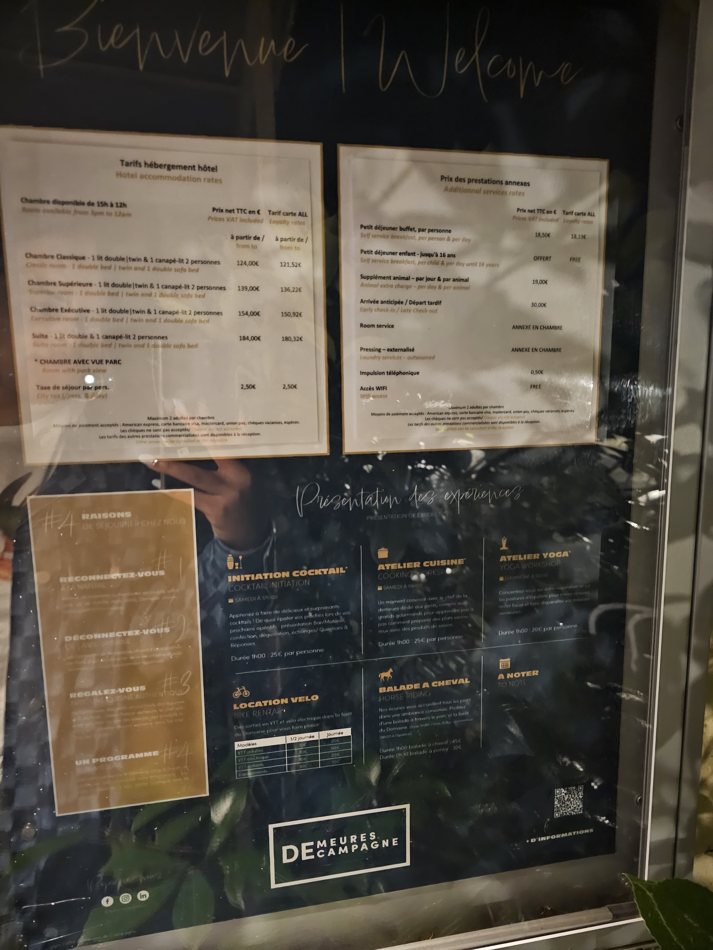 Séjour réservé via ventes privées donc en all inclusive :surclassement de la chambre, mini bar,chaussons, peignoir, Petit déjeuner copieux et qualitatif, Dîner qualitatif. Activités diverses et merveilleuses : Équitation avec Rémi (top des tops) initiation et balade en forêt. Piscine, cinéma en extérieur. Séjour dans un écrin de verdure à 1 heure de Paris. Merci à Grégory pour son accueil et son professionnalisme Qui a veillé à notre bien-être durant notre séjour. Seule remarque le château qui a brûlé est encore en travaux mais domaine vraiment agréable. Merci à tous.