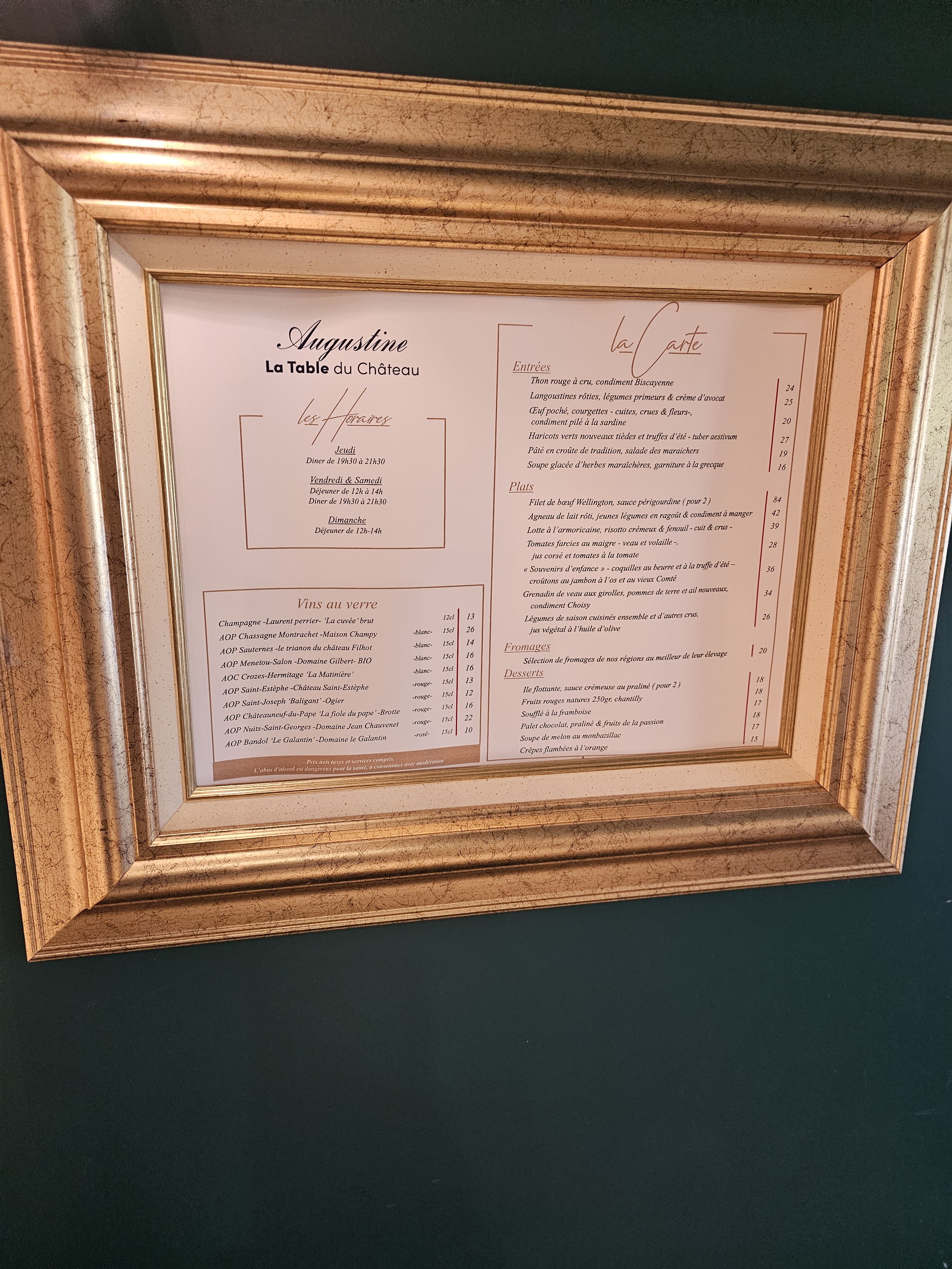 Bonjour, nous avons été accueilli comme il se doit par Florian un jeune homme très souriant qui nous a fais passé un moment extraordinaire à mon chéri et moi même. Ce jeune homme mérite des félicitations de la part de sa hiérarchie pour son professionnalisme. Nous remercions aussi toute la cuisine, (cuisinier et pâtissier) , qui malgré l’heure tardive n’a pas hésité à nous servir. C’est pourquoi nous vous recommandons vivement de passer par la brasserie du domaine.