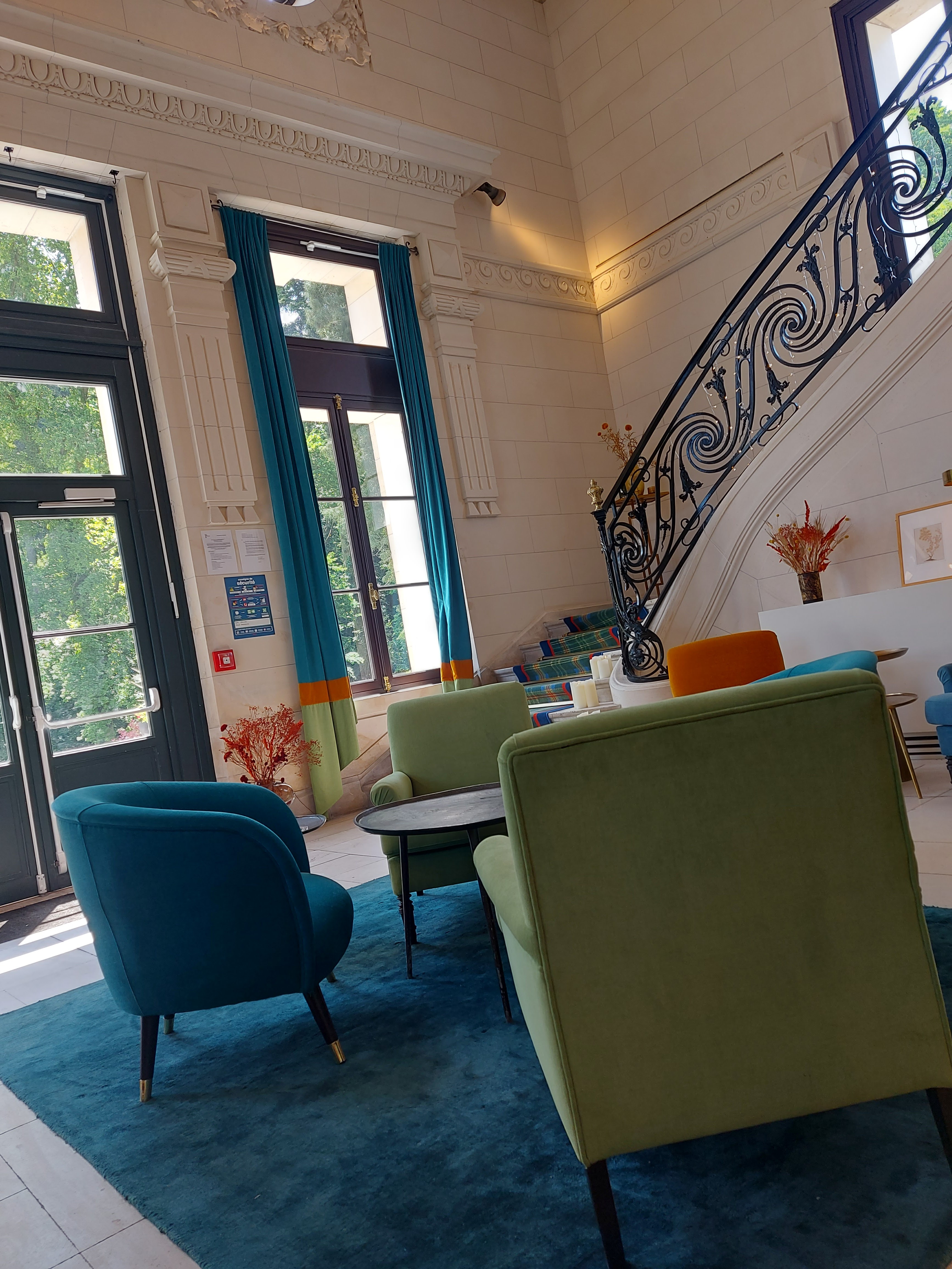 Hôtel agréable, bien placé pour le calme et la tranquillité. Pour l'accueil : très bien, rapide, efficace et très agréable. La décoration de l'accueil très sympa, dommage qu'il y ait pas le suivis dans les couloirs amenant au chambres. Tout le personnel que j'ai croisé était au petit soin et polie. Pour les chambres manque de modernité. Dressing bas de gamme pour un 4 étoiles dommage. Il manque une deuxième prise du côté du lit dommage je pensais pas qu'il fallait amener une multiprise. Dommage aussi il y a le peignoir mais manque les chaussons pour la sortie de douche et pour la moquette au sol. Il manquait également du micro lait pour le café ou le thé. Pour l'extérieur piscine très agréable mais toujours aussi pénible les transats réservé par les services avant l'aller prendre le petit-déjeuner et le déjeuner. Zéro contrôle dommage. Le parc verdoyant vraiment top et calme, les chevaux sont au rendez-vous, magnifique. Coin pour les boulistes pour le ping-pong et Coin pour aire de jeux. Le château magnifique, Très bonne accueil, personnel agréable l'entrée du château avec le bar magnifique bien décoré. Les autres pièces du château sont décoré avec beaucoup de goût entre modernité et ancien chic... Salle de billard 🎱 Restaurant top Brasserie sympathique. Côté restauration de la brasserie bon assiette correct manque une touche de déco dans les assiettes. Merci au barman pour les cocktail 🍸 Le bémol pour moi c'est pas un endroit pour se ressourcer, le week-end ou nous y sommes allés il y avait beaucoup de famille avec des enfants en bas âge.