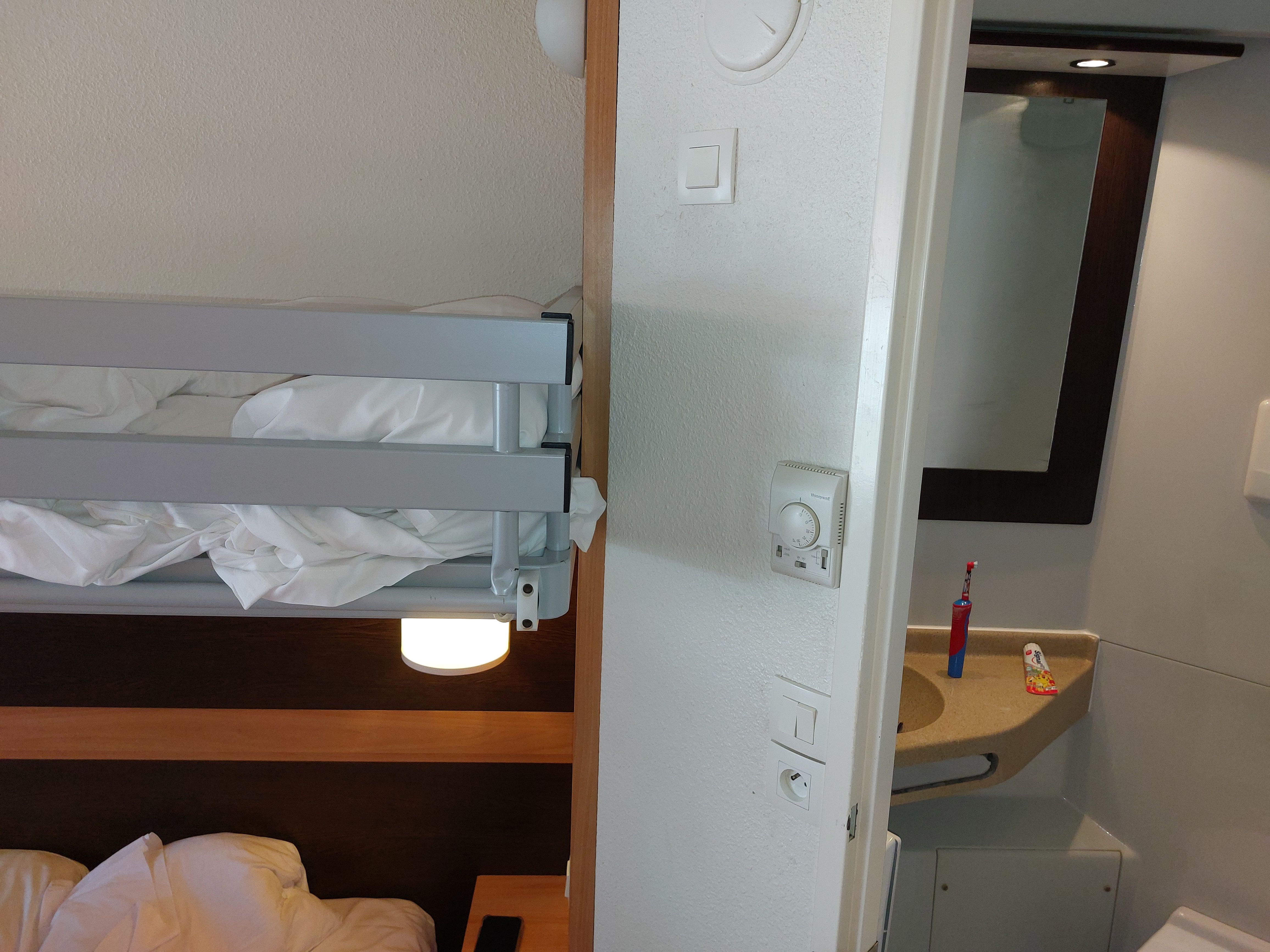Hotel très mediocre, chambre tres petite et salle de bain minuscule, si vous etes clostrophobe je vous déconseille , par contre chambre assez propre malgré la vétusté du lieu. Porte hyper gondolé et dure à ouvrir. Le lit superposé est proche du plafond, ma fille s'est cogné. Pour ma part je n'ai pas entendu trop de bruit durant la nuit, mais j'ai ai été réveillé le matin par le vibreur de la chambre d'à côté, je vous laisse donc vous faire une idée de l'isolation.l'hotel en lui meme n'inspire pas confiance. Sinon receptionniste à l'accueil de l'hôtel d'à Côte très serviable. Je ne reviendrai pas et ne conseil pas cet hôtel.