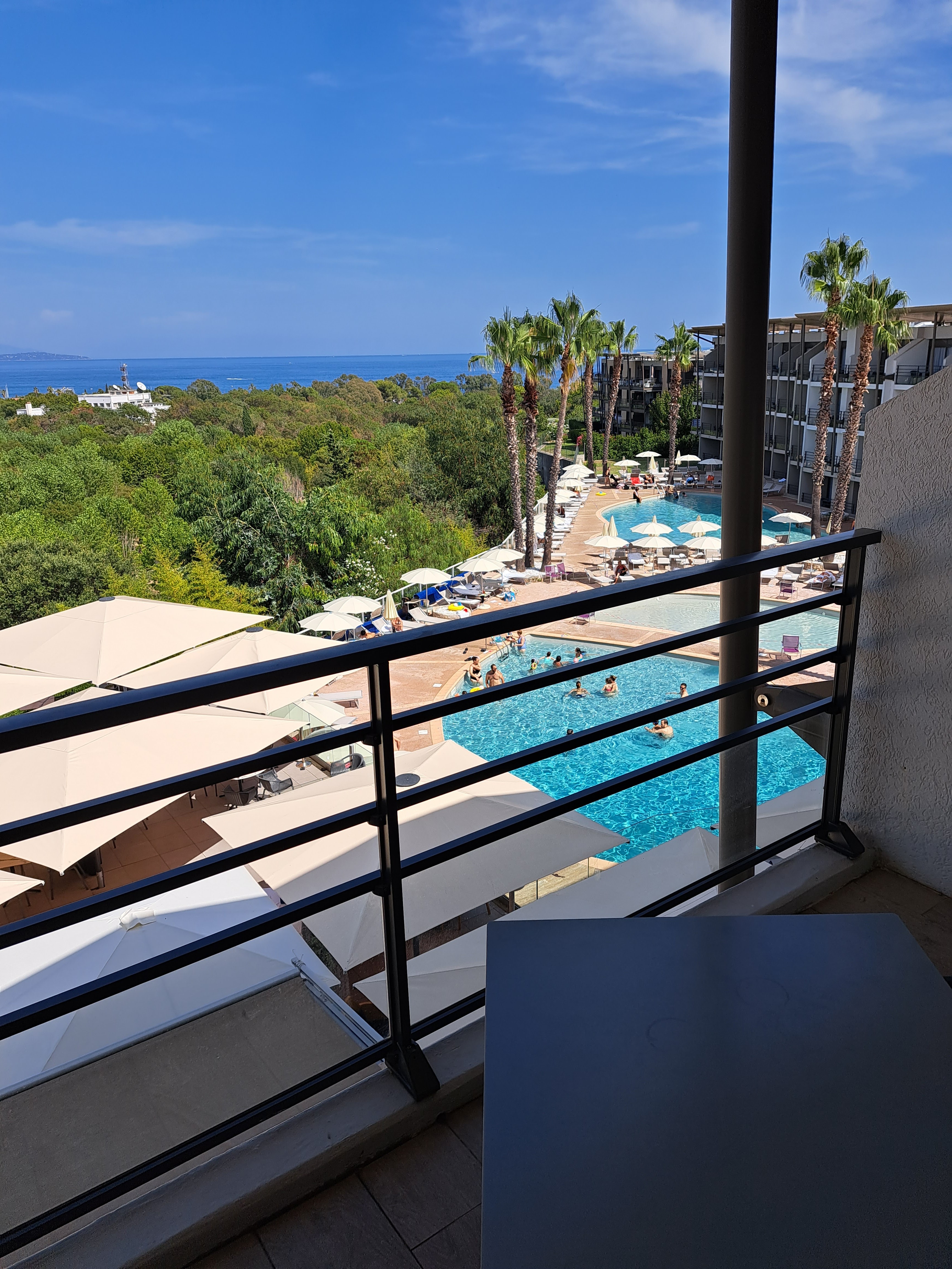 Mon 1er 4 étoiles en France. Ravie, sur les hauteurs d'Antibes, au calme, verdure, 3 piscines d'eau de mer, chambre individuelle très grande, vue sur la Baie des Anges et piscines, belle terrasse, literie exceptionnelle, souci pour sortir de la baignoire, appui sur les WC juste à côté, tout le personnel très agréable et compétent, cuisine pour moi gastronomique, personnel du restaurant très professionnel, d'une grande gentillesse, proche de chaque client, sans faire la thalasso, j'ai profité de l'espace marin d'eau de mer avec tous les jets Seule petit souci pour moi, venue en train, très gênée dans la marche, je n'ai pu sortir de l'hôtel pendant 5 jours, car rien autour, en dehors d'habitations résidentielles. Petit bemol: chambre disponible à 18h au lieu de 16h